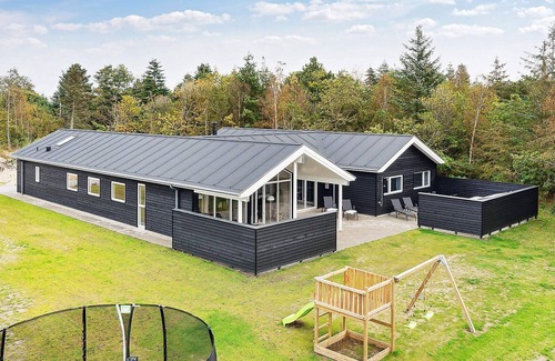 Distribución: Caseta de piscina: salón(nevera con congelador , secadora, lavadora), cocina(fogón(eléctrico), cafetera, lavavajillas, nevera, trona), salón-dormitorio(TV(canales de televisión alemanes, canales de TV daneses)), dormitorio(cama doble), dormitorio(cama doble), dormitorio(2x cama individual), dormitorio(2x cama individual), dormitorio(2x cama individual), dormitorio(2x cama individual), dormitorio(2x cama individual), cuarto de baño(lavabo, ducha, váter), cuarto de baño, cuarto de baño, espacio vacío(4x cama individual plegable, cama infantil), videoconsola, lavabo, ducha, váter, calefacción(radiador(es) eléctrico(s)), muebles de jardín, tumbonas, juegos infantíl, mesa de ping-pong, futbolín, dardos, billar, calor geotérmico