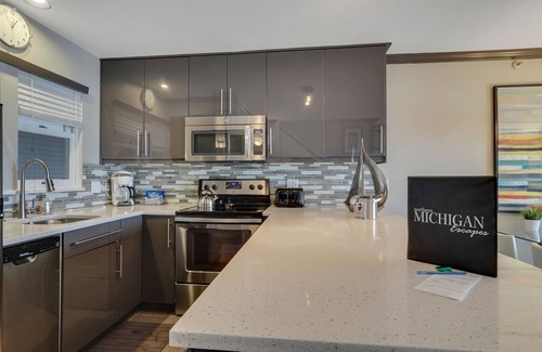 Suite 311 es una suite en el tercer piso, totalmente renovada y decorada con buen gusto, con impresionantes vistas del lago Charlevoix. La cocina cuenta con hermosas encimeras de alta gama, electrodomésticos de acero inoxidable y un horno de tamaño completo. Va a encontrar esta cocina totalmente equipada con utensilios y platos para preparar comidas. La mesa de cristal comedor tiene capacidad para cuatro personas. La sala de estar cuenta con un sofá cama de tamaño queen, chimenea de gas y un televisor de pantalla plana de 50 pulgadas. La puerta corredera de cristal se abre a un balcón privado con vistas a la playa privada. Arriba se encuentra un cuarto de baño con ducha Euro cerrado con puertas de cristal y dos tocadores separados. La habitación del segundo piso tiene una cama king size, un televisor de pantalla plana de 32 pulgadas y otra vista espectacular del lago Charlevoix.