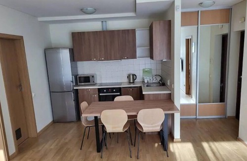 WI-FI coverage is available throughout the apartment, cable internet connection is available at the workplace, internet speed is up to 100Mbps. There is a TV with 57 channels. The kitchen has a fridge-freezer, electric hob, electric oven, dishwasher, electric kettle, full set of plates, pots, pans, cutlery, glasses, cutting boards and everything you may need for cooking.