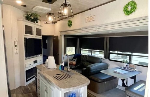 Inside the fully stocked camper you will find 2 separate bedrooms. In the front of the camper is a bedroom with a Queen bed, in the rear of the camper is a bedroom with a Full bed and a full size loft above it. There is a full bathroom with shower in the front, and a ½ bath in the back. In the middle is the living room and kitchen. Living room has TV, Fireplace, two recliners and a dinette. Kitchen has a residential size refrigerator, 3 burner gas range and oven, and large pantry. You will find all the supplies you need, just bring your own food.