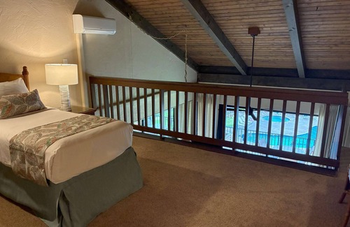 Your basecamp boasts a fully stocked kitchen, inviting you to prepare delicious meals with ease. The comfortable living room area provides a cozy space to unwind, while the beautiful lanai patio offers a rare 180° view of the surrounding paradise. On the main floor, the master bedroom incorporates a comfortable queen bed and six-drawer dresser along with a master bathroom. Also on the main floor is a guest bedroom with another queen bed and second bathroom. The loft area includes three additional twin beds ensuring ample room for larger parties. Additional amenities include split AC units in the living room, master bedroom and guest bedroom, ensuring your utmost comfort. Plus, a washer and dryer are conveniently located within the unit.