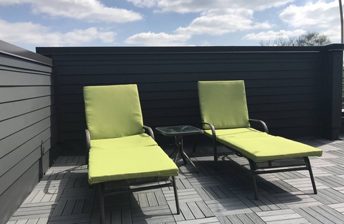 Para disfrutar de un espacio exterior más grande diríjase a la azotea del cuarto piso para su propio patio en la azotea. Nuestra azotea ofrece un patio que bordea las copas de los árboles, con parrilla de gas, muebles Comfort y sillones. Nuestros hilos de luz Edison crean una gran atmósfera.