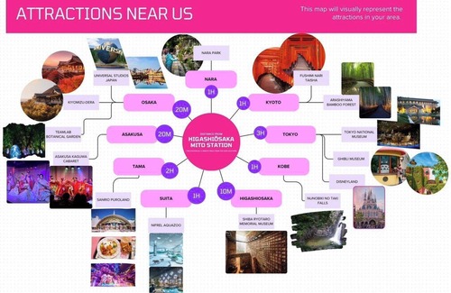 Este apartamento de 7 dormitorios y 9.5 baños está ubicado en Higashi-osaka, una ubicación ideal para explorar los alrededores. A los amantes de la naturaleza y el aire libre les encantará estar a 10min en coche de Parque del Castillo de Osaka y a 25min de Parque conmemorativo Expo '70. Puedes conducir 11min hasta Torre Tsutenkaku o 11min hasta Nipponbashi. Descubre otras zonas y adéntrate más en Higashi-osaka: estarás a 3min a pie de la Estación de tren de Mito y a 12min de la Estación de tren de Kyuhojiguchi, de modo que coger el metro te resultará muy sencillo.