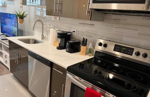 Al instalarte en este alojamiento de 1 dormitorio y 1 baño, encontrarás una sala de estar, un comedor, aire acondicionado y escritorio. Conéctate al wifi, o relájate frente a un Smart TV. El cuarto de baño incluye un secador de pelo, toallas y papel higiénico. La cocina está equipada con horno, placa de cocina y frigorífico, además de cafetera y tetera, máquina de hielo y microondas. Y no tendrás que llevarte ropa de más, porque podrás aprovechar la lavadora y la secadora. Otras comodidades incluyen ropa de cama, una tabla de planchar, servicio de limpieza disponible a petición y calefacción.