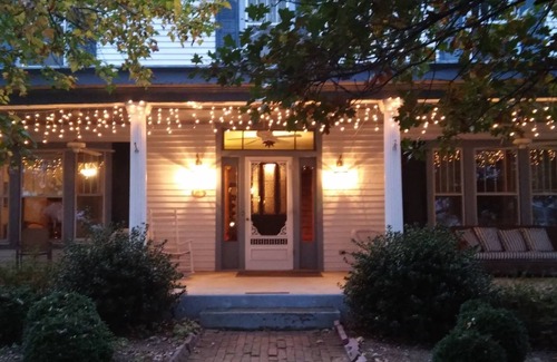 Hay una suite principal de 2 habitaciones en el piso principal con chimenea de gas. La casa tiene columnas interiores de roble en la entrada principal y suite principal y techos altos en todas partes. Los espaciosos vestíbulos y pasillos, una amplia escalera principal y una estrecha escalera trasera, contribuyen al ambiente. La unidad circular, la pasarela de ladrillos, el amplio porche delantero con columpios y los muebles de mimbre lo llevarán al pasado, así que traiga su guitarra, banjo, teclado o armónica si desea tocar algunas canciones después de la cena. Esta casa cuenta con un amplio comedor, una mesa redonda de roble para comer en la cocina y taburetes de bar en la isla, una amplia sala de lavandería con una bañera elevada para el aseo y el cuidado de sus mascotas. Podemos servir una comida para sentarse de 30 a 38 en interiores, o 60 en porches cubiertos, y podemos acomodar tiendas de cualquier tamaño.