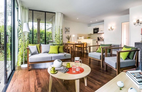 "Cottage Pagode Premium", casa 3 habitaciones 55 m2. Luminoso, con mobiliario confortable y agradable: salón-comedor con puerta corredera, ventanal con chimenea y TV. Salida a la terraza. 1 dorm. con 1 cama doble (180 cm, 200 cm de longitud). 1 dorm. con 2 camas (80 cm, 200 cm de longitud). Cocina abierta (4 fogones, lavavajillas, tostadora, hervidor de agua eléctrico, cafetera eléctrica, microondas/grill) con mesa de comedor. Baño, WC separado, bañera de hidromasaje. Suelo de madera. Terraza. Muebles de terraza. El alojamiento dispone de: trona, cuna, secador de pelo. Internet (Wifi). Plaza de aparcamiento (1 coche). A tener en cuenta: apartamento para no fumadores. El alojamiento es una casa tipo ejemplo o un apartamento tipo ejemplo.