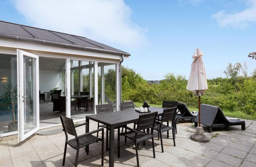 La terraza con vistas al mar invita a disfrutar del aire fresco del mar y contemplar la puesta de sol sobre la bahía de Ebeltoft.