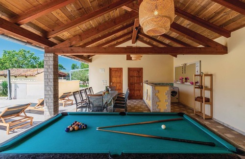 Si sois una familia numerosa y queréis pasar unas vacaciones inolvidables, esta preciosa villa de vacaciones es ideal para vosotros. Es muy moderno y amueblado con todas las comodidades imaginables y tiene una hermosa terraza cubierta con barbacoa de piedra. El hermoso y amplio jardín está vallado y por lo tanto muy adecuado para los niños. Para mantenerse activo, tiene a su disposición billar, ping-pong y dardos. Haga largos paseos en bicicleta o emocionantes excursiones a la ciudad de Pula, a 15 minutos en coche, que tiene un interesante mercado de pescado, o vaya a la isla de Brijuni, donde viven muchas cebras y donde se encuentran los olivos más antiguos del país. El casco antiguo de Rovinj y Hum, la ciudad más pequeña del mundo, también merecen una visita. También la ciudad de Vodnjan, donde encontrará la Basílica de San Blasius con la torre de iglesia más alta de Istria y la oportunidad de visitar una envidiable colección de momias. Estas numerosas opciones de actividades harán que sus vacaciones parezcan casi demasiado cortas.