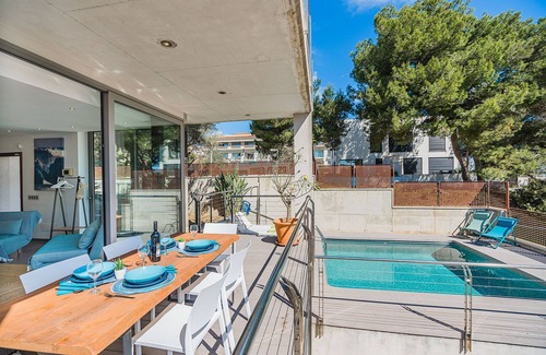 Hay un amplio y moderno salón comedor con grandes puertas que dan a una terraza amueblada con vistas a la piscina. La casa también tiene conexión WiFi.