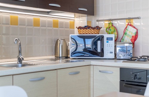 Adecuado para familias, la cocina está equipada con microondas, hervidor de agua, cafetera espresso con cápsulas, tostadora, nevera y accesorios de cocina.