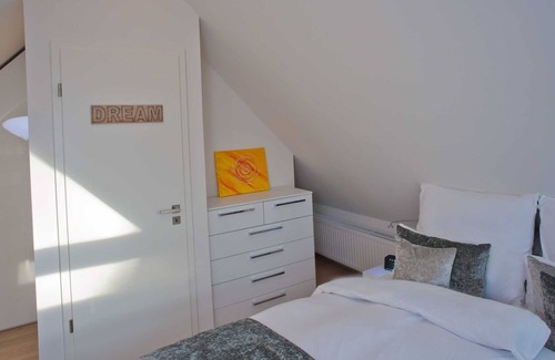 El dormitorio del dúplex (al que se accede por una cómoda escalera de roble) tiene una cama con somier tamaño king de hotel de 1,60 x 2,10 m con dos edredones tamaño king de 1,45 x 2,20 m así como dos almohadas (80 x 80 cm y 40 x 80 cm), todas llenas de lámparas 100% canadienses de pluma de cuello de cisne, invitan a la hora de dormir y las lámparas de suelo con detectores de movimiento aseguran que en la oscuridad solo queden sus piernas Tienes que balancear la cama y luego encender una luz correspondiente. Un armario, una cómoda, una mesa baja y dos mesitas de noche y un "sirviente mudo" están disponibles. El gran elemento de ventana triangular está equipado con placas de atenuación para el oscurecimiento. Un televisor de pantalla plana (43 pulgadas / 108 cm en diagonal, Samsung). El radio reloj tiene una estación de carga QI para teléfonos celulares habilitados para QI (carga inalámbrica) y un cable de carga para iPhone en cada mitad de la cama y una estación meteorológica con pantalla de temperatura interior y exterior. La cocina moderna es de alta calidad y está completamente amueblada: nevera y congelador, lavavajillas, horno de aire caliente y vitrocerámica, microondas, cafetera premium Siemens, licuadora profesional AEG, cafetera, tostadora, hervidor de agua, olla eléctrica, eléctrica. Batidora de mano, batidora, del exprimidor de cítricos profesional, bloque de cuchillos gourmet WMF, un servicio de Seltmann Weiden, cubiertos WMF, vasos de Schott Zwiesel, sobre ollas / sartenes con cacerola de Kitchen Aid / WMF / Jamie Oliver Tefal Silit + y mucho más hasta la prensa de ajo es "todo" disponible, ¡lo que hace que el corazón de un chef hobby cante!