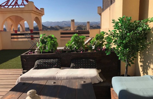 Apartamento con encanto, con dos plantas, la de arriba un solárium con tumbonas, barbacoa, césped artificial, pérgola de 20 m2 y tarima de madera. La planta de abajo tiene una terraza de 20 metros cuadrados totalmente amueblada. El interior está totalmente amueblado, con Blue Ray, DVD, Televisión de 42 pulgadas, Aire acondicionado, WIFI, etc.