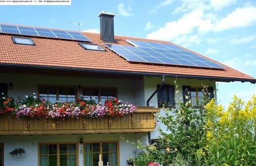 Vives idílicamente en medio de prados verdes con vistas a las montañas Allgäu