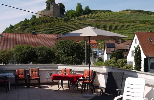 La superficie habitable es de 90 m². El apartamento accesible por separado tiene una vista de 50 m² y un solárium, que solo está disponible para los huéspedes. // Parquet de madera interior en las habitaciones, sala de estar y pasillo. Suelos de gres en cocina y baño. Colores brillantes y amigables, calefacción central. // Área de dormir Dos habitaciones, cada una con una cama doble, una habitación con cama y espacio para dormir en la sala de estar para dos personas. Armarios empotrados en las habitaciones. Se puede proporcionar una cuna (cuna de viaje). // Cocina comedor Cocina completa equipada con estufa, horno, refrigerador, congelador, lavavajillas, hervidor de agua, cafetera, tostadora, radio. Mesa de comedor para 5 personas. Acceso directo a la terraza. Desde cuchillos hasta ollas y sartenes hasta sacacorchos, todo lo que necesita para trabajar en la cocina está disponible. // baño ducha, inodoro, doble lavabo, secador de pelo. Sala de secado independiente, tabla de planchar y plancha. Lavadora que se puede utilizar de forma gratuita para estancias más largas. // Sala de estar Equipada con TV, radio, reproductor de CD, acceso a Internet a través de WLAN, sofá (que también se puede usar como cama para dos personas), así como libros y varios juegos. // Sombrilla de 50 m², seis sillas, dos mesas, barbacoa bajo petición. Si hace buen tiempo, es posible tomar el sol en cualquier momento del día. Al igual que el apartamento, la terraza está en el primer piso y apenas es visible. Ofrece una vista fantástica del castillo de Lichteneck, el castillo de Hecklinger y los viñedos circundantes. // Plaza de aparcamiento exterior en frente de la casa. Se puede acceder al apartamento por su propia escalera exterior. Tenis de mesa en el patio cubierto o en el prado es posible. El parque infantil más cercano está a unos 200 metros.