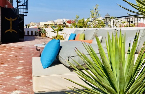 Gran terraza en la azotea con una increíble vista panorámica del océano y estas olas, las montañas del Atlas y el valle de Aourir.