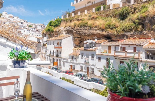 The exterior of the house is equally impressive, with views capturing the charm of the streets of Setenil de las Bodegas, famous for their unique cave houses. Plants and details on the balcony contribute to a fresh and relaxing atmosphere.