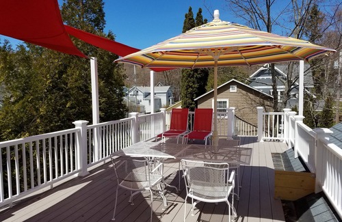 Disfrute de la brisa de la playa del lago Michigan mientras se relaja en la cubierta trasera de esta encantadora casa antigua a solo unos pasos del agua.