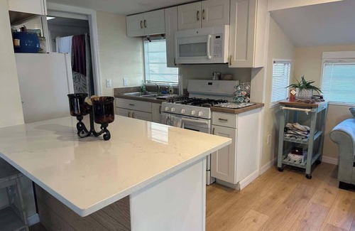 This cozy beach cottage has everything you need for a relaxing vacation including a large bathtub.