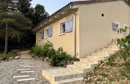Esta hermosa casa de bungalows de 80 metros cuadrados se encuentra en el valle de la montaña de la pequeña aldea de Sampzon.