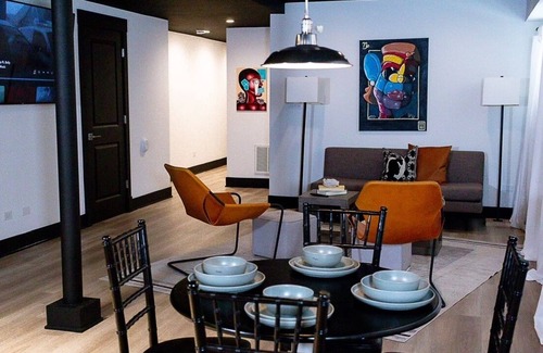 Located in the historic neighborhood of Bronzeville, this new construction bungalow is a perfect place to stay in Chicago. Just 10 minutes away from the notable Hyde Park area and walking distance to public transportation. Minutes away from the highway, Lakeshore Drive and The Loop this 3 bedroom, 2 bathroom high ceiling Bungalow can be your home away from home. Once you cross the threshold you will be met with high ceilings, an array of local black art, a spa like en suite bathroom off the primary bathroom, a modernized kitchen fully stocked to be used, and comfortable rooms with a rustic look. This bungalow is perfect for a self care escape or a retreat for friends. There is an additional full bathroom and laundry room to add to your great time in Chicago.