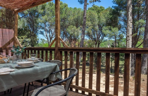 It is ideal for people who prefer a quiet and ecological rest. The Bungalow is located in the Lacus campsite just 600 meters from the Riells beach and it is surrounded by the forest with its own lake. The area is very pleasant for walking and cycling, practicing yoga and mindfulness, playing sports and playing with children and pets. You can rent 3 bungalows at the same time with a total capacity of 13 people. It the perfect possibility to spend your holidays with your friends, the whole family or organize a retreat of spiritual practices. Each bungalow consists of 2 bedrooms, a living-dining room with a fully equipped kitchen, its own shower and toilet. It also has a large terrace with a table to eat outdoors and views of the forest. Each bungalow has access to free wi-fi and a free parking space.