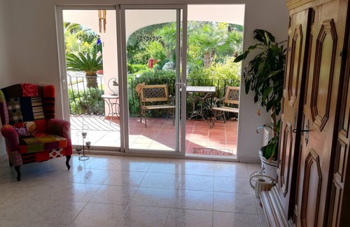 La gran piscina con su acogedora terraza está disponible para todos los huéspedes, así como el gran jardín con hermosos jardines, esculturas, estanques, fuentes u. Los lugares de descanso te invitan a relajarte. En unos 6 - 8 km de distancia hay dos campos de golf. Un centro comercial (Portal de las Marinas) se encuentra a unos 8 km.