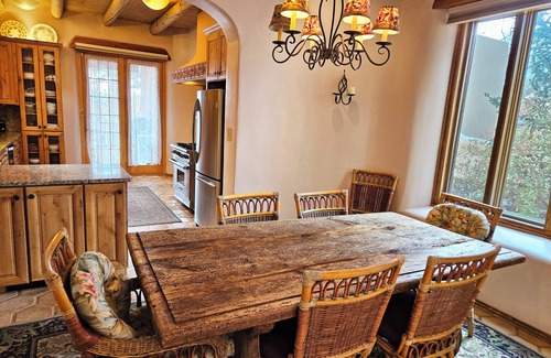 Taos Casa Bella - una exclusiva casa de adobe con vista personalizada, en la prestigiosa comunidad de Los Altos en Taos, Nuevo México se encuentra a la salida de Taos Ski Valley Road entre la ciudad y las laderas. Los huéspedes disfrutan del encanto ecléctico del suroeste / país francés, muebles de buen gusto y 4 habitaciones con cama extragrande. Para acomodaciones flexibles para dormir, la cama King del dormitorio del den se puede convertir en 2 gemelos. Asegúrese de notificar al cuidador mucho antes de la llegada si su grupo necesita gemelos.