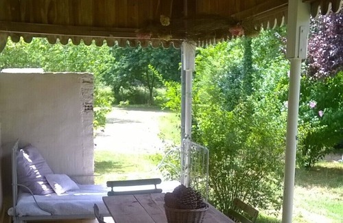 Hermosa terraza cubierta en jardín cerrado con árboles y barbacoa.