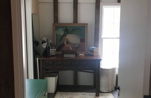 Gran salón, comedor, sala de estar, cocina, baño con bañera y ducha con patas; Porche trasero cubierto y terraza en la azotea, ambos abiertos a acres de bosques. Camino de grava inclinada. Las comodidades incluyen calefacción central y aire acondicionado, lavaplatos, microondas, estufa a gas, refrigerador pequeño, lavadora y secadora, vaporizador de telas, plancha y tabla de planchar (consulte la tabla de tamaño completo debajo de la cama doble), sistema estéreo con colección de vinilo vintage y función Bluetooth auxiliar , televisión por cable, wifi y monitores Nest. La cocina y el aparador están completamente equipados con cafetera, utensilios de cocina y utensilios automáticos. Encuentra ropa de cama extra y toallas en los aparadores y armarios.