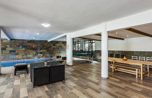 Anexa a la casa tenemos una zona de ocio con piscina climatizada, mesa de ping-pong, cama elástica de 3,5 m de diámetro, sala de juegos, barbacoa y horno de leña. La zona de ocio también dispone de baño completo, cocina y despensa. Además, la propiedad cuenta con un campo de fútbol, una cancha de baloncesto y un campo de minigolf.