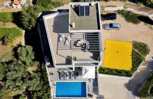 Villa M- rodeado de naturaleza con piscina climatizada y pista polideportiva La encantadora y lujosa villa familiar en Makarska (6+2) es perfecto para unas vacaciones en familia. Ofreciendo un hermoso panorama sobre el mar Adriático y las islas de Hvar y Brač, y sin embargo, sólo un corto 5 minutos en coche del centro de Makarska en el este y Baška Voda y Brela en el oeste, la villa es la casa contemporánea y moderna excepcional más de 4 plantas, y la decoración se ha inspirado en los elementos del mar. Los colores calmantes, las piedras y los elementos de la historia antigua crean un ambiente relajante. Con piscina privada y pista deportiva, podrá llenar su día de sol y risas. Rodeado de naturaleza y al abrigo de la montaña Biokovo se sentirá seguro y protegido y nos aseguraremos de satisfacer todas sus necesidades.es adecuado para 6 + 2 personas.