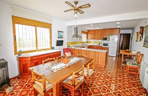 La casa tiene 2 plantas que se comunican con escaleras interiores. Se entra directo a una cocina grande totalmente equipada con comedor, seguida de una sala de estar con SAT + TV otra pequeña sala de estar con TV y chimenea, en esta planta nos encontramos con 2 habitaciones dobles,un cuarto de baño completo, una habitación con 2 camas, 1 habitación individual con cuarto de baño completo, equipados con secador de pelo, en la planta superior tenemos 2 habitaciones dobles, una habitación individual, una habitación con litera y un aseo, salimos a una terraza exterior con vistas a la terraza de la piscina y a las playas de Calpe y también a las montañas de La sierra de Oltá y a la sierra de Bernia. También dispone de barbacoa equipada con frigorífico, lavavajillas y cocina de gas.