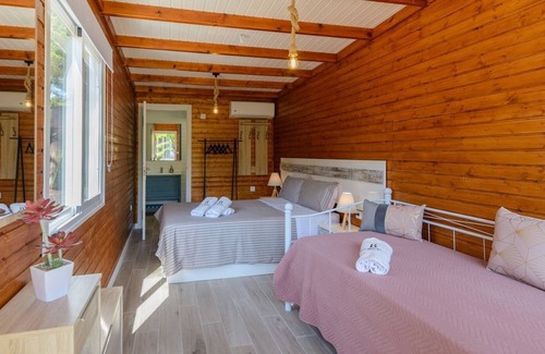 Las cuatro cabañas se ubican cerca del edificio principal, rodeada por vegetación exuberante. Se caracterizan por el mismo diseño: cada una de estas cuenta con paredes de madera, amplios ventanales, una cama de matrimonio y una individual, y un moderno cuarto de baño ensuite con plato de ducha.