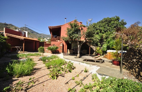 Jardín-Huerto con mobiliario y jacuzzi.