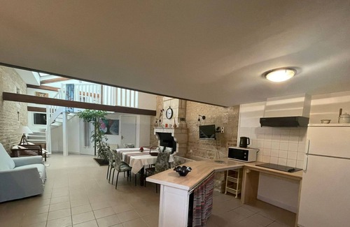 Antiguo establo restaurado, con dependencias anexas, situado en el pequeño pueblo de Lesson, en el corazón del Marais Poitevin, un sitio importante en Francia. Entrada y terreno independientes. Planta baja: salón/cocina americana (TV adaptada para personas sordas o con dificultades auditivas), 1 dormitorio (1 cama doble, 1 cama individual), cuarto de ducha/WC. Planta alta: 1 dormitorio (2 camas dobles), cuarto de ducha/WC. Cuna disponible y silla de bebé bajo petición. Wifi. Calefacción parcial mediante pozo canadiense (difusión de aire caliente) incluida. Terreno cerrado y ajardinado de 150 m² (mobiliario de jardín, barbacoa, tumbonas), trastero cerrado para bicicletas. Niort 12 kilómetros. Opciones: