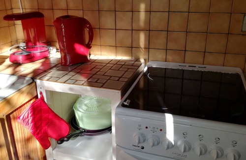 pequeña cocina con horno, nevera / congelador, microondas, vajilla, pequeños ustensibles, cafetera, tostadora, etc ...