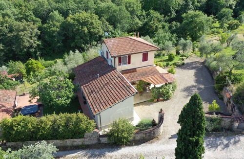 casa unifamiliar en la pequeña aldea de 4 edificios en el campo de la Toscana entre bosques y campos de olivos y vides en una zona montañosa a 300 m s. L. M. en el Valdarno superior. Es un punto de partida ideal para itinerarios culturales y gastronómicos y experimentar la naturaleza en la relajación perfecta.