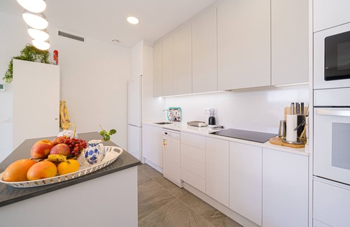 La cocina americana, de vitrocerámica, está equipada con nevera, microondas, horno, congelador, lavavajillas, vajilla/cubertería, utensilios/cocina, cafetera, tostadora, hervidor de agua y exprimidor.