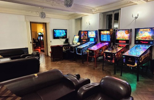 Un gran salón con sofás 7, 3 sillones, 2 máquinas de pinball virtuales, y 2 mesas de café "arcade"
