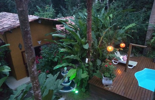 Encantadora casa de campo en Jardim odOYÁ Casa Hotel. Ubicado en medio de un hermoso jardín tropical con plantas y flores exóticas, un lago de tilapia y una hermosa fuente frente a la cabaña. Cuenta con dos suites Queen Size con baño privado, además de una acogedora sala de estar y una cocina equipada con estufa, refrigerador Frost Free, horno eléctrico, cafetera y utensilios para su comodidad. Las puertas de madera del chalet se abren a un exuberante jardín en la parte posterior del área común de la propiedad, que consta de una terraza de madera con piscina, una ducha de agua artesiana y una cocina al aire libre. El chalet está bordeado por la parte posterior por una extensa área de bosque nativo que da acceso al río das Mares. El silencio del bosque junto con el pequeño agua de la fuente es una invitación a la relajación. Los animales salvajes como el tamarino estrella, el mono capuchino, las ardillas, el insecto perezoso y varios especímenes de aves y mariposas son visitantes de rutina al jardín y cabaña Odoyya. El entorno bucólico de la propiedad, debido a la tranquilidad y las calles arboladas y florecidas, es un incentivo para largas caminatas. Un paraíso dentro del paraíso, a menos de 7 minutos a pie de la histórica plaza de Trancoso.