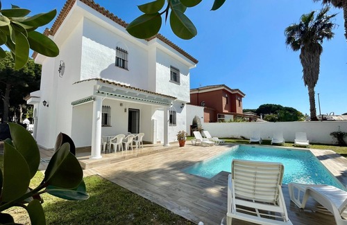 Chalet en Chiclana de la frontera con piscina privada y Wifi. Es ideal para familias que quieren disfrutar de una vacaciones cerca de la playa. Tiene capacidad para 9 personas.