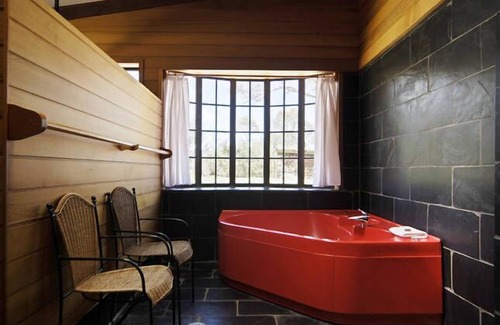Alojamiento de lujo construido en estilo suizo con madera tintada e interiores de madera, pisos de pizarra con calefacción por suelo radiante y una gran chimenea de piedra. Sala de relajación privada con spa, sauna y una ducha extra y aseo.