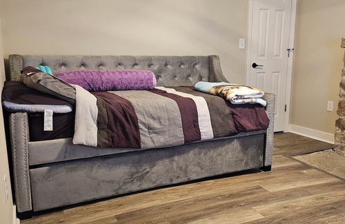 Experience Roanoke like a local in this 2-bedroom cabin. Enjoy the pleasant surroundings and modern comforts including heating, AC, WiFi, and a washing machine. With 2 bathrooms and convenient amenities like an iron and hair dryer. Nice deck off the master bedroom. Covered front porch with grill.