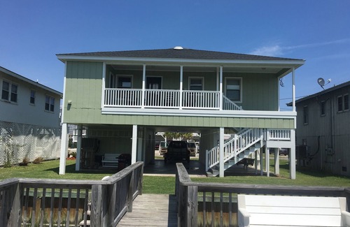 Porche trasero cubierto con rockeros, vistas muelle y canal. 1 dormitorio con cama queen y 1 cama individual, 2 habitaciones cada una con cama queen. 1 dormitorio con 2 juegos de literas. tamaño de la reina sofá cama en el salón. Casa para 13 personas. Sábanas y toallas de baño. Lavadora y secadora en el conveniente cuarto de lavado de arriba. Madera y suelos de vinilo en todas partes. Las comodidades al aire libre incluyen una parrilla al aire libre y una mesa de picnic, y una excelente terraza / muelle ideal para pescar, practicar cangrejos, tomar el sol o simplemente pasar el rato. El área pavimentada debajo de la casa es un lugar fresco y ventoso para disfrutar de las vistas del canal en un columpio. El dragado de canales en 2017 lo mejoró enormemente. El muelle flotante fue reemplazado en mayo de 2018. Trae el bote! Fácil de caminar a la playa. Pasarela de playa pública al final de esta calle. Barrio tranquilo, cerca de muchos restaurantes, tiendas, campos de golf y atracciones.