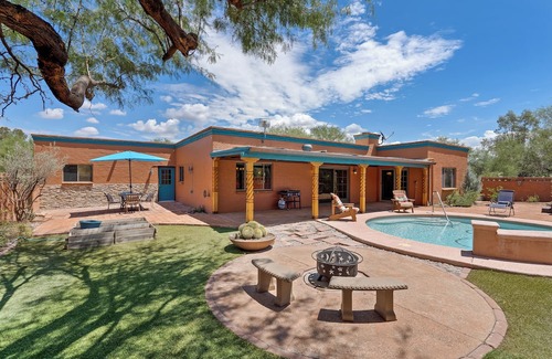 This delightful house in Tubac offers 3 bedrooms on a private acre, adjacent to the renowned Tubac Golf Resort and Spa. Private pool and hot tub on the property plus access to the resort pool, tennis courts, golf, spa, restaurant and bar. A variety of sleeping arrangements are available including a king bed, 2 queen beds, and a bunk bed. Home office setup with dual monitors and docking station. The 2 bathrooms are equipped with showers and hair dryers for your convenience. Two fire pits to enjoy the amazing stars at night, with no light pollution. With pleasant AC and heating, you'll stay comfortable no matter the weather. This tremendous home is the perfect spot for guests looking to relax and unwind, but also want access to the resort amenities and historical town of Tubac minutes away. You're sure to make fantastic memories with a stay at our place. Contact us if you would like to use the golf cart.