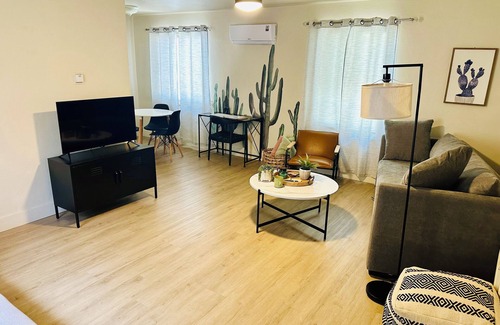 La cocina está equipada con horno, placa de cocina y frigorífico, además de cafetera y tetera, microondas y utensilios de cocina. Conéctate al wifi, o relájate frente a un Smart TV. El cuarto de baño incluye toallas, papel higiénico y jabón. Y gracias a la lavadora y la secadora, podrás viajar con poco equipaje. Otras comodidades de este alojamiento de 1 dormitorio y 1 baño incluyen ropa de cama, una tabla de planchar, aire acondicionado y calefacción.
