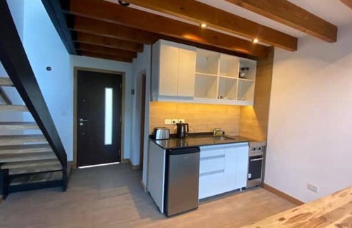 Departamento tipo loft con un dormitorio abalconado en el entrepiso, este, cuenta con una cama king size, y vistas por ambos costados del mismo a las montañas, en planta baja hay un baño con bañera y detalles muy elegantes de terminación, una cocina totalmente equipada con mesa y sillas para 4 huéspedes , la misma se encuentra integrada al living que cuenta con un sofá que se hace cama queen size, el mismo tiene amplios ventanales de 4 metros por 8 metros de altura. Este loft es ideal para una pareja , o una familia con un hijo grande o dos pequeños.