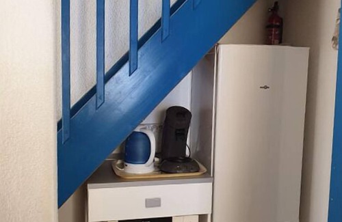 Se compone de una sala de estar / comedor con TV, equipo de música, sofá, una cómoda grande y una despensa, una mesa y sus sillas. La pequeña cocina equipada es muy funcional con lavadora, horno, vitrocerámica, fregadero, etc. y debajo de las escaleras, justo enfrente, hay una nevera / congelador, microondas, hervidor de agua y Senseo. El baño y el aseo están separados.