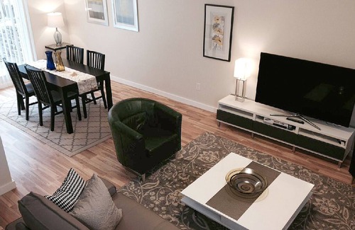 Nuestra sala de estar cuenta con asientos de cuero de primera calidad, suntuosas almohadas y mantas, y una chimenea eléctrica. También encontrará un nuevo televisor Samsung HD de 55 'y un reproductor de blue ray. La sala de estar se abre a un elegante comedor que puede acomodar cómodamente hasta seis. Una puerta corrediza de vidrio conduce a un pequeño patio al aire libre donde puede disfrutar de un poco de aire fresco y su taza de café o cóctel por la mañana. El comedor también tiene un cómodo acceso a la cocina. Los tomacorrientes en el paso están equipados con enchufes USB para permitir un segundo espacio de trabajo. Disfruta de wifi gratis en toda la casa.
