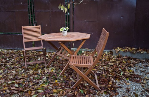 Terraza cubierta con barbacoa y mesa de comedor. Muebles de jardín en la terraza.